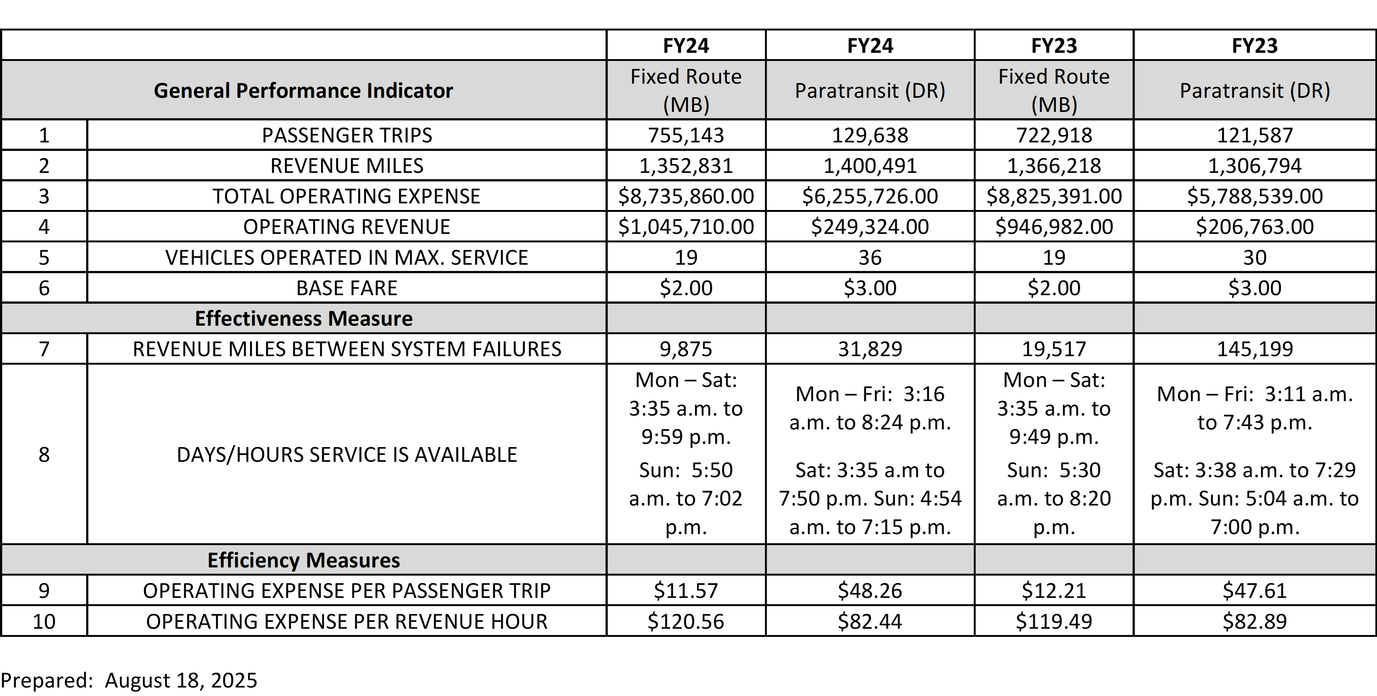 The purpose of this publication is to provide general information concerning system management, performance, productivity, cost distribution and safety of the Collier County Transit System. The data reported includes two (2) modes of operations: Fixed Route (buses) and Americans with Disabilities Act (ADA) Demand Response. These performance indicators are published annually pursuant to Florida Statute 341.071. For additional information on how these measures are collected and reported contact Collier County Public Transit & Neighborhood Enhancement at (239) 252-5841.
